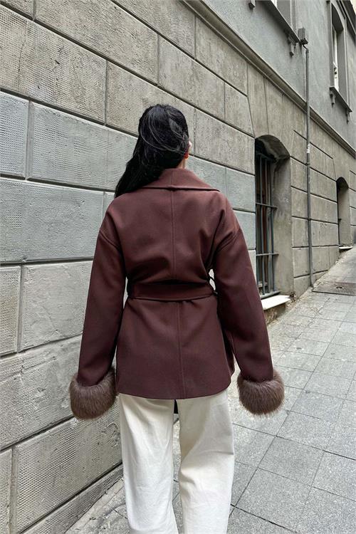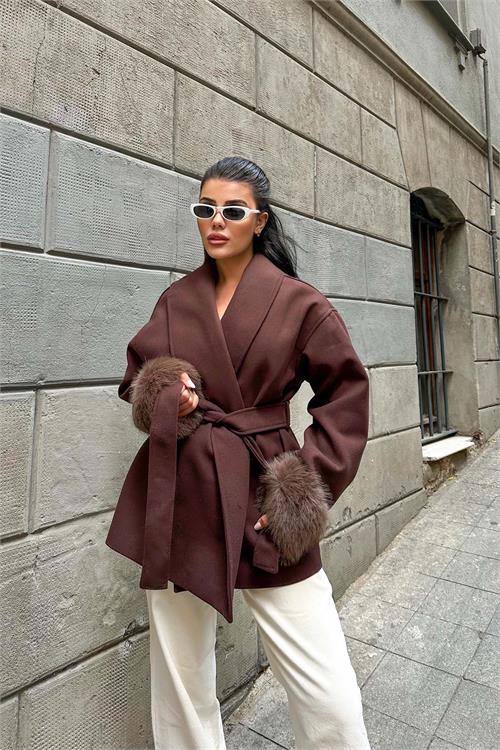 Kahverengi kürk detaylı kaban, zarif duruşu ve modern kesimiyle günlük ve şehir kombinlerine şıklık kazandırır. Kruvaze yaka tasarımı klasik bir görünüm sunarken, kol uçlarındaki yumuşak kürk detaylar modele sofistike bir hava katar. Astarlı yapısı konforlu kullanım sağlarken, kuşaklı tasarımı bel hattını isteğe göre şekillendirme imkânı sunar. Rahat ve geniş kalıba sahip olan model, daha toparlayıcı bir duruş isteyenler için bir beden küçük tercih edilebilir. Günlük kullanımdan özel kombinlere kadar geniş bir kullanım alanına sahiptir.