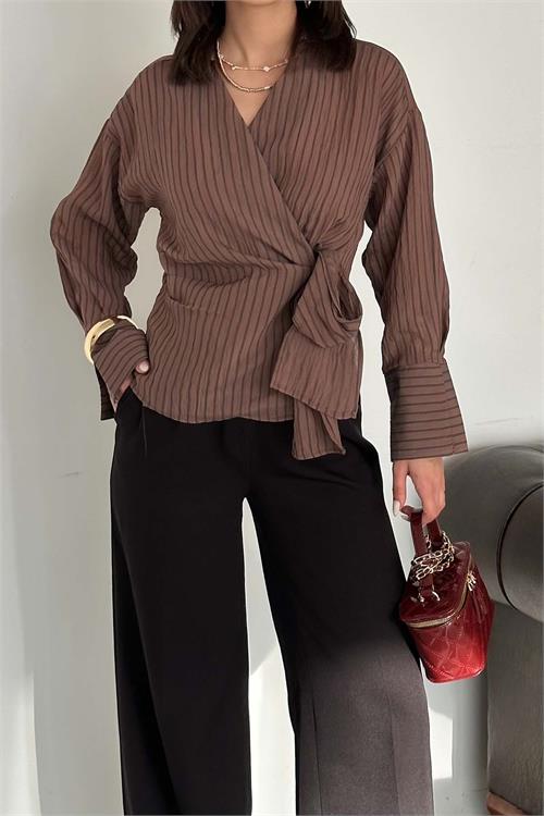 Kadın Kahvrengi Çizgili Kruvaze Bağlama Detaylı Gömlek ESR064