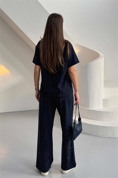 Kadın Lacivert Modal Kumaş Taş Detaylı Pantolon Tişört Takım ESR044