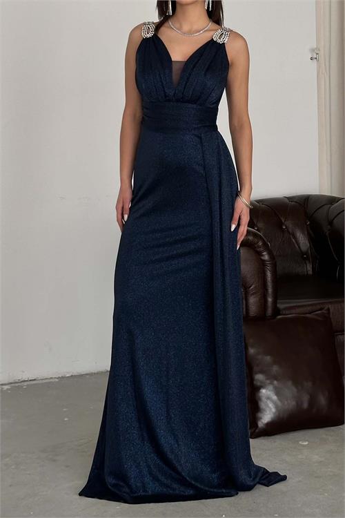 Kadın Lacivert Simli Kumaş Büyük Beden Abiye Elbise ESR073