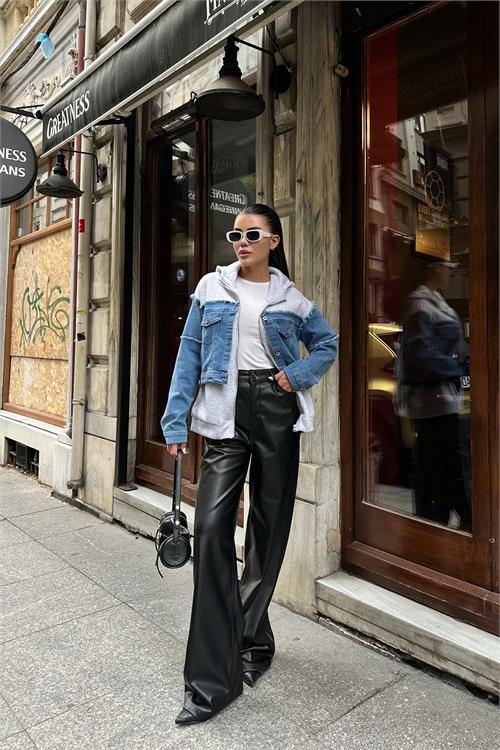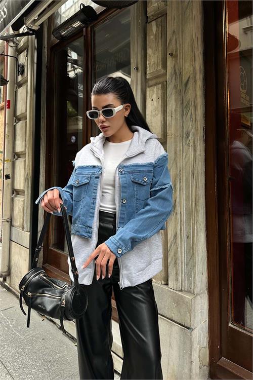 Modern şehir stilini yansıtan denim detaylı kapüşonlu ceket, spor ve şıklığı tek parçada buluşturur. İç kısmındaki yumuşak dokulu sweatshirt yapısı ile gün boyu konfor sağlarken, dış yüzeydeki denim detayları güçlü ve trend bir görünüm sunar. Fermuarlı yapısı sayesinde pratik kullanım imkânı sunan bu parça, günlük kombinlerde vazgeçilmeziniz olacak.