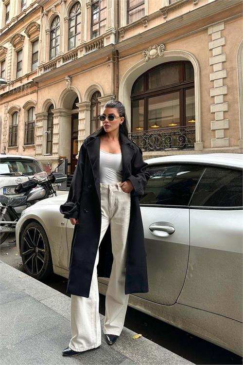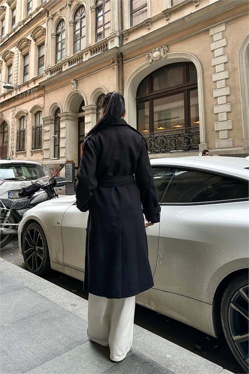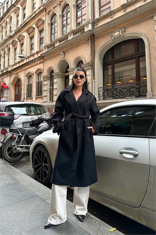 Kadın Siyah Kuşaklı Rahat Kalıp Astarlı Kaban | Şık Model ESR002