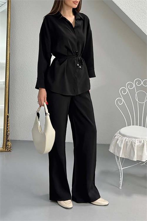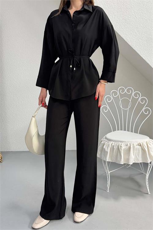 Düğmeli gömlek tasarımı ve bel kısmındaki bağlama detayı takıma zarif bir siluet kazandırırken, rahat kesimli pantolon günlük kombinlerde şık ve dengeli bir görünüm oluşturur. Minimal ve zamansız tasarımı sayesinde hem günlük kullanımda hem de şehir stilinde kolayca kombinlenebilir.