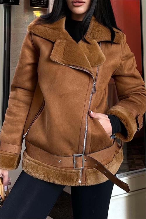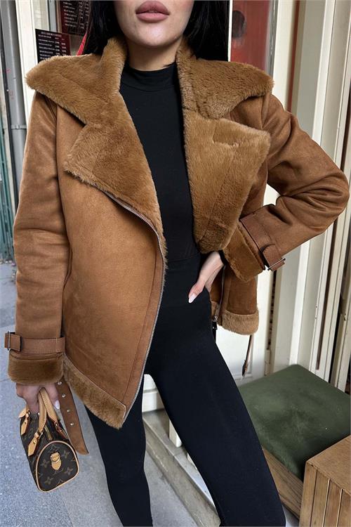 Taba kürk detaylı ceket, iç yüzeyinde kullanılan tavşan tüyü astarı sayesinde son derece yumuşak bir dokuya sahiptir ve serin havalarda sıcak tutan konforlu bir kullanım sunar. Kürk detaylı yakası ve manşetleri modele zarif bir görünüm kazandırırken, kuşaklı tasarımı bel hattını isteğe göre ayarlama imkânı sağlar. Astarlı yapısı ile gün boyu konfor sunan bu ceket, hem günlük kombinlerde hem de şık şehir stilinde rahatlıkla tercih edilebilir.