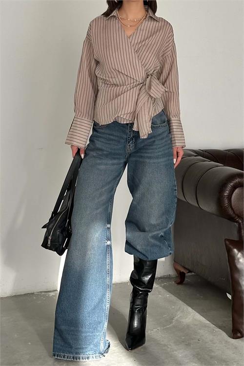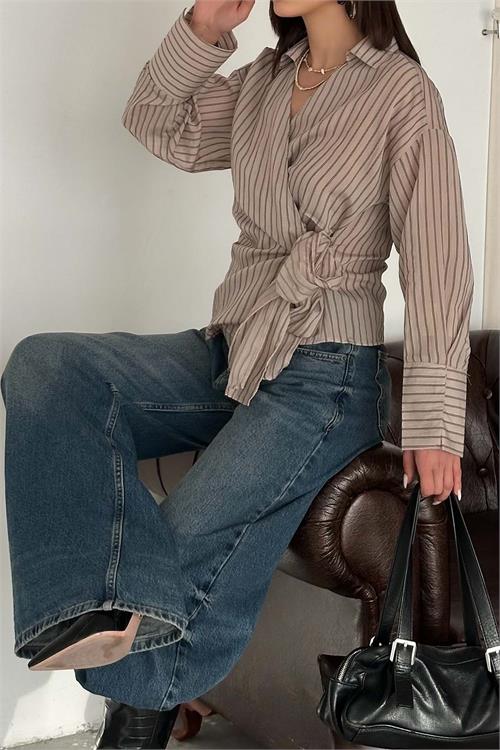 Modern çizgili deseni ve şık kruvaze formuyla öne çıkan gömlek modeli, bağlama detayı sayesinde vücuda uyum sağlayarak feminen ve dengeli bir siluet oluşturur. Hafif ve akışkan yapısı gün boyu konfor sunarken, hem günlük kombinlerde hem de daha şık stillerde rahatlıkla kullanılabilir. Vizon tonunun sıcak ve sofistike duruşu, kombinlerinize güçlü bir karakter katar.