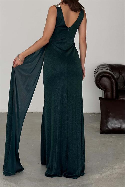 Kadın Zümrüt Yeşili Simli Kumaş Büyük Beden Abiye Elbise ESR073