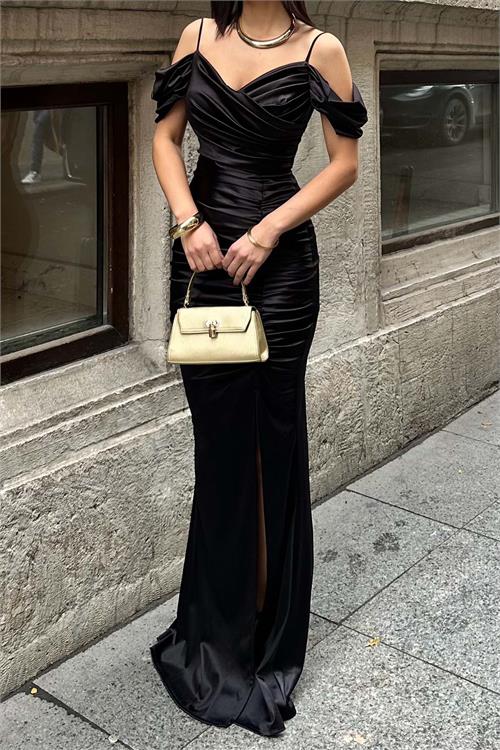 saten abiye elbise, drapeli uzun elbise, askılı abiye, yırtmaçlı gece elbisesi, balık model abiye, şık davet elbisesi, mezuniyet elbisesi