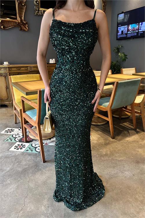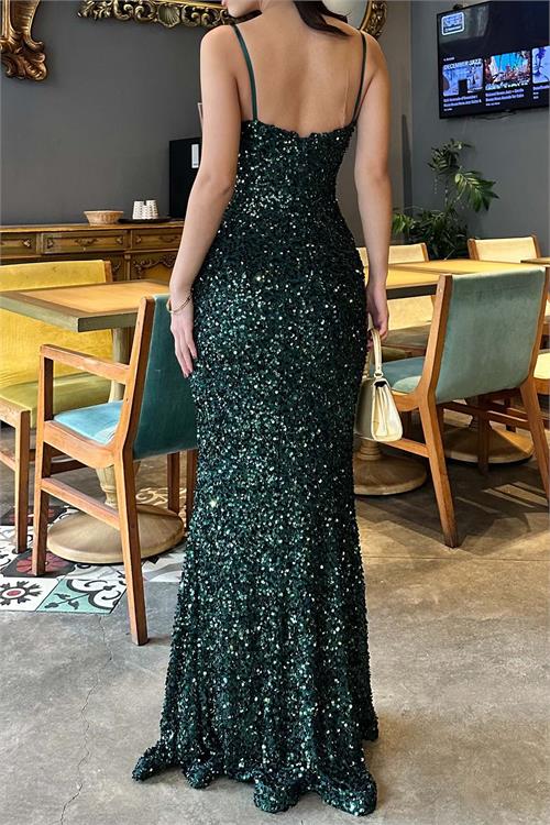 Zümrüt Yeşili Pul Payetli Uzun Abiye Elbise | Astarlı Şık Gece Elbisesi ESR033